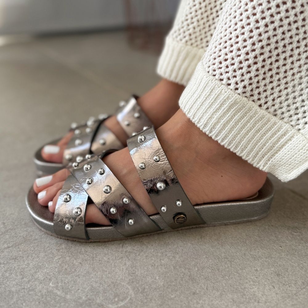 SANDALIAS PLANAS CUERO TACHES EVA PLOMO